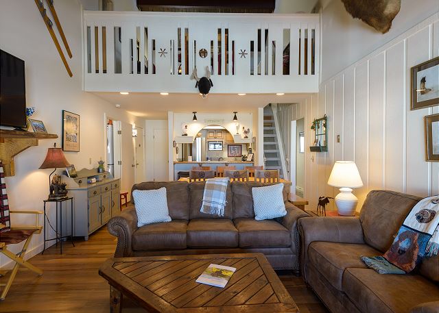 The main level features three bedrooms and two bathrooms, while the upper level includes a sleeping loft, a fourth bedroom, and an additional bathroom. The condo is fully furnished, including linens and dishes, and even includes a private washer and dryer for added convenience.