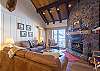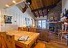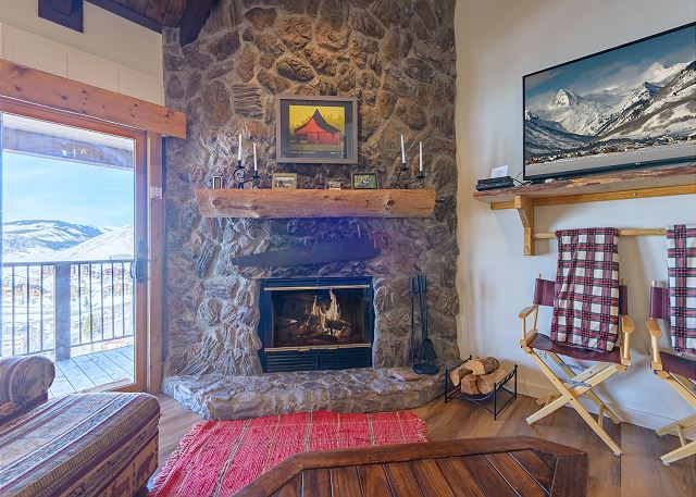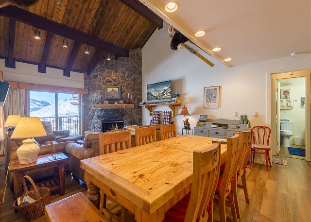 The expansive open-concept living and dining area centers around a striking stone, wood-burning fireplace—we provide the firewood—creating a warm and inviting gathering space. The fully equipped, walk-through kitchen makes it easy to prepare family meals. Two sliding glass doors open to a large shared balcony, where you’ll enjoy sweeping views of the West Elk Mountains.